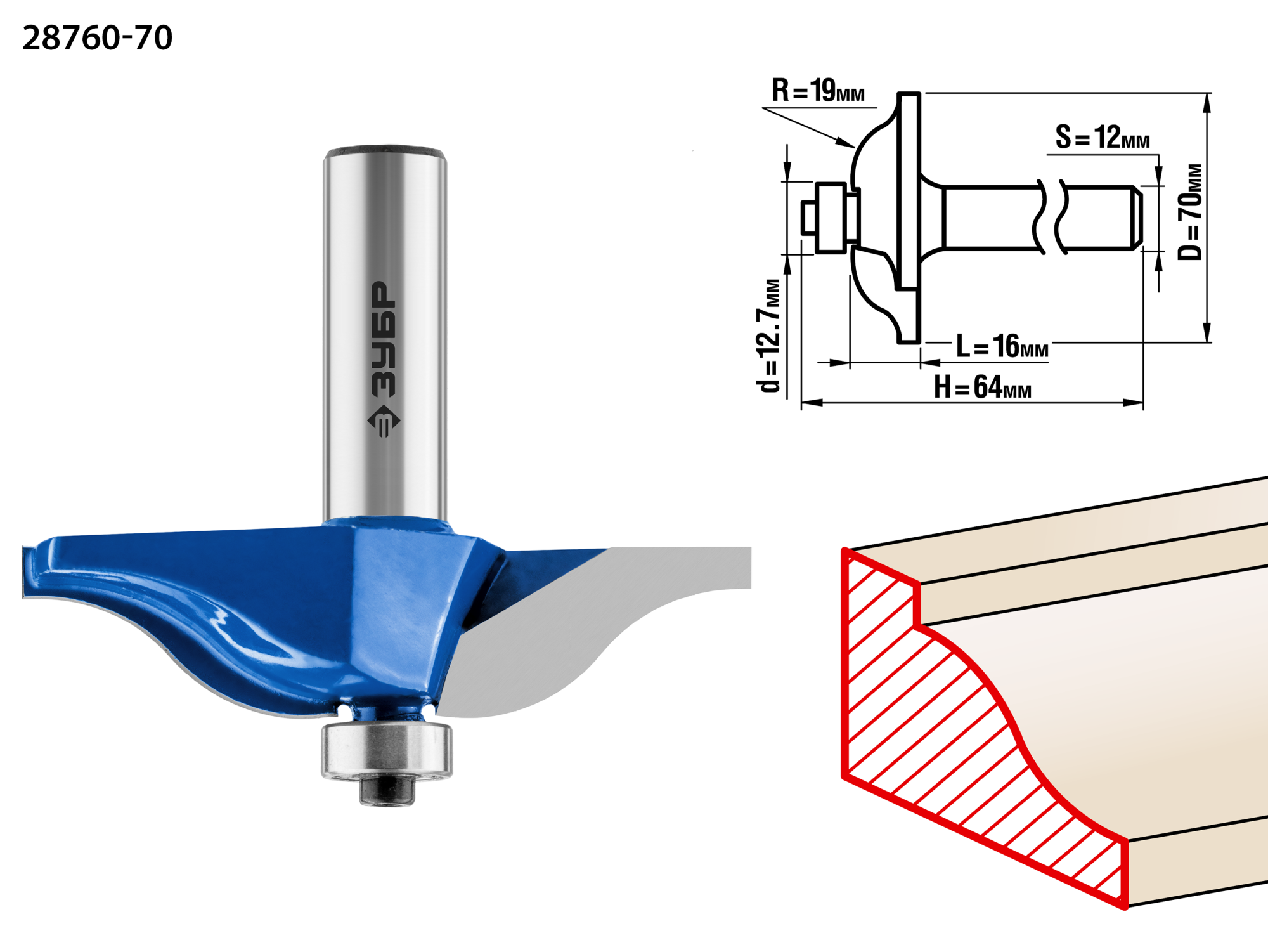 Фреза фигирейная №1, D= 70мм, рабочая длина-16мм, радиус-15,8мм, хв.-12мм, d-12,7мм, ЗУБР Профессионал / 28760-70