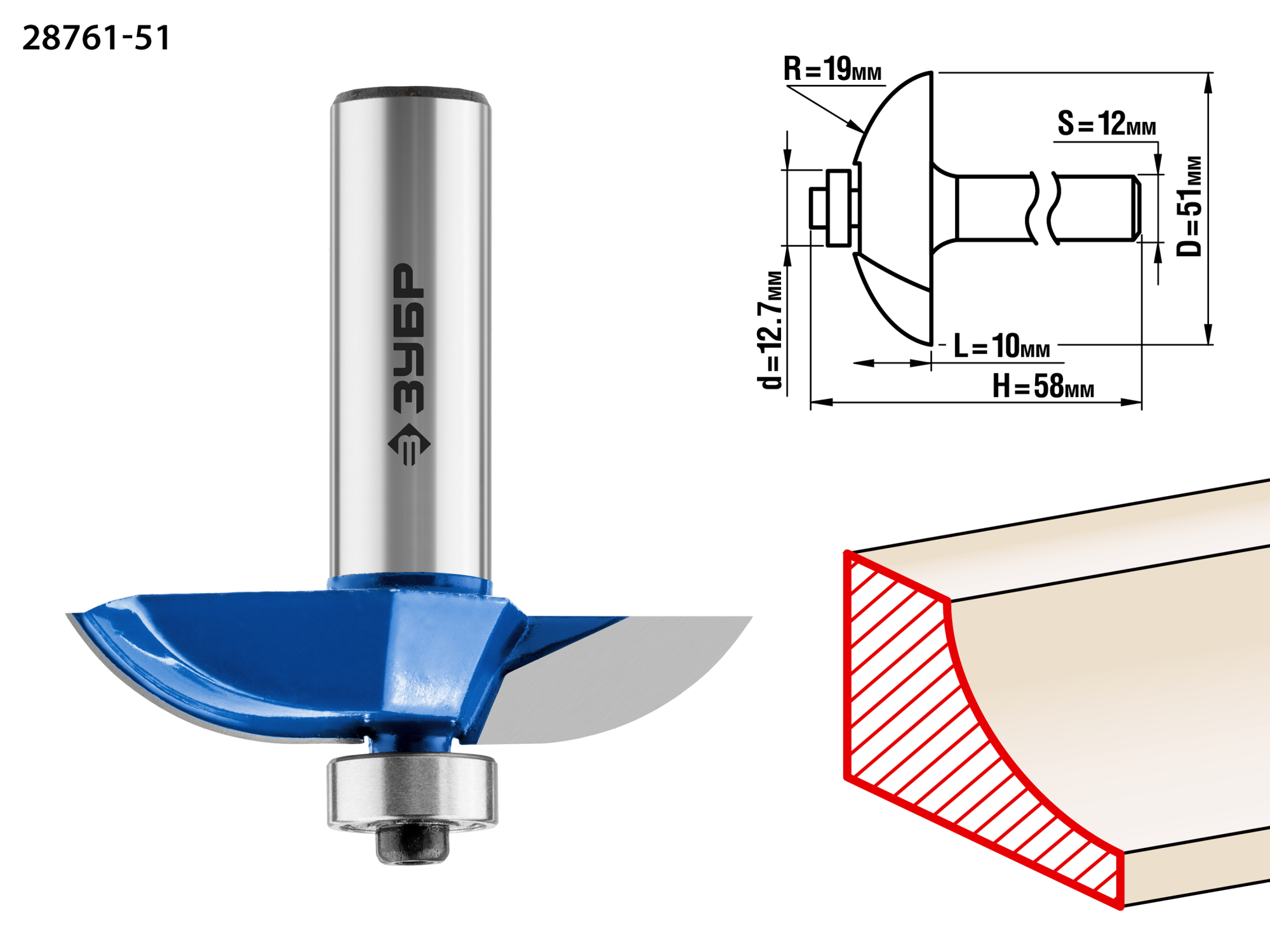 Фреза фигирейная №2, D= 51мм, рабочая длина-13мм, радиус-19мм, хв.-12мм, d-12,7мм, ЗУБР Профессионал / 28761-51