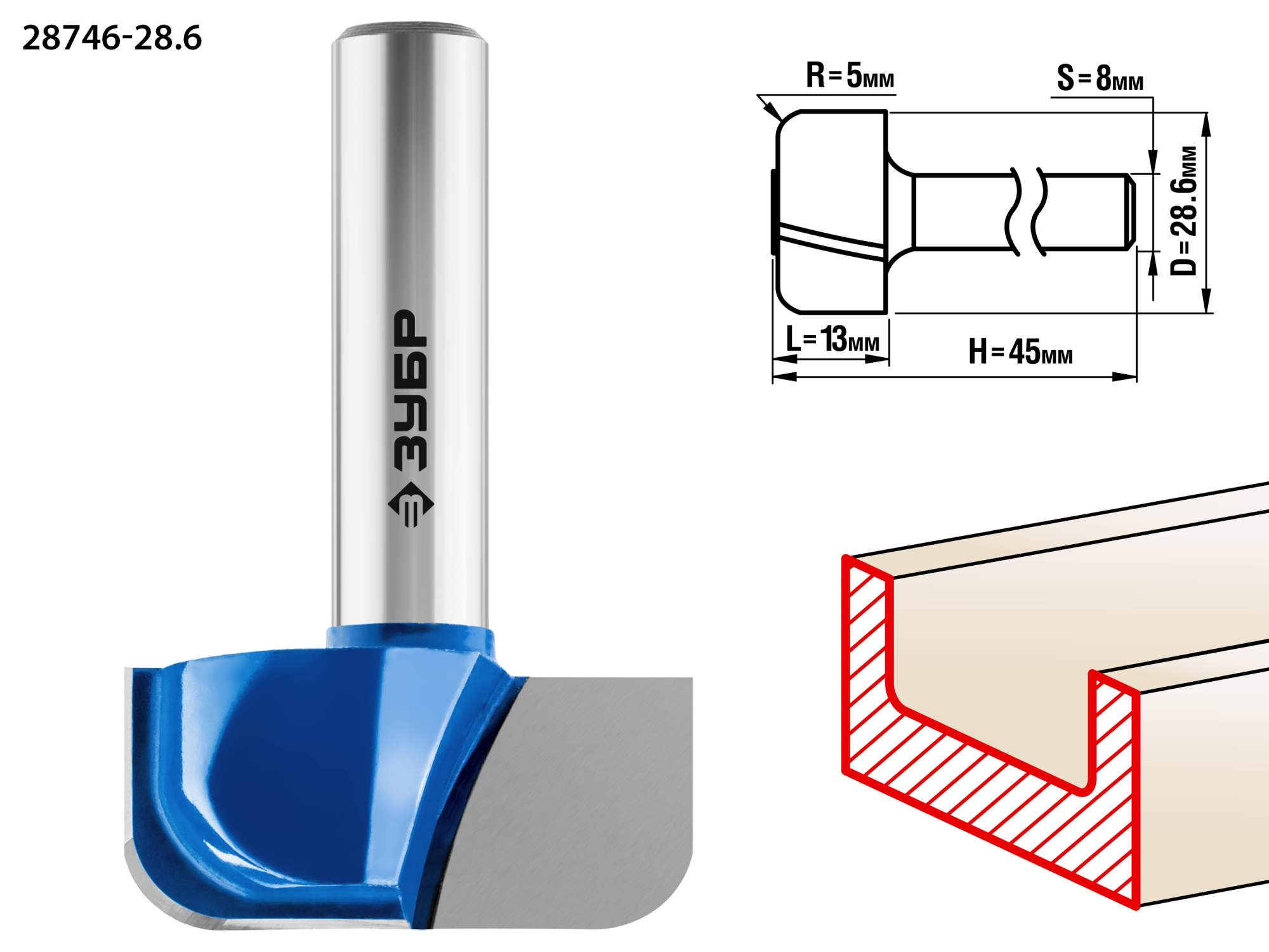 Фреза пазовая фасонная №7, D= 28,6мм, рабочая длина-13мм, радиус-5мм, хв.-8 мм, ЗУБР Профессионал / 28746-28.6