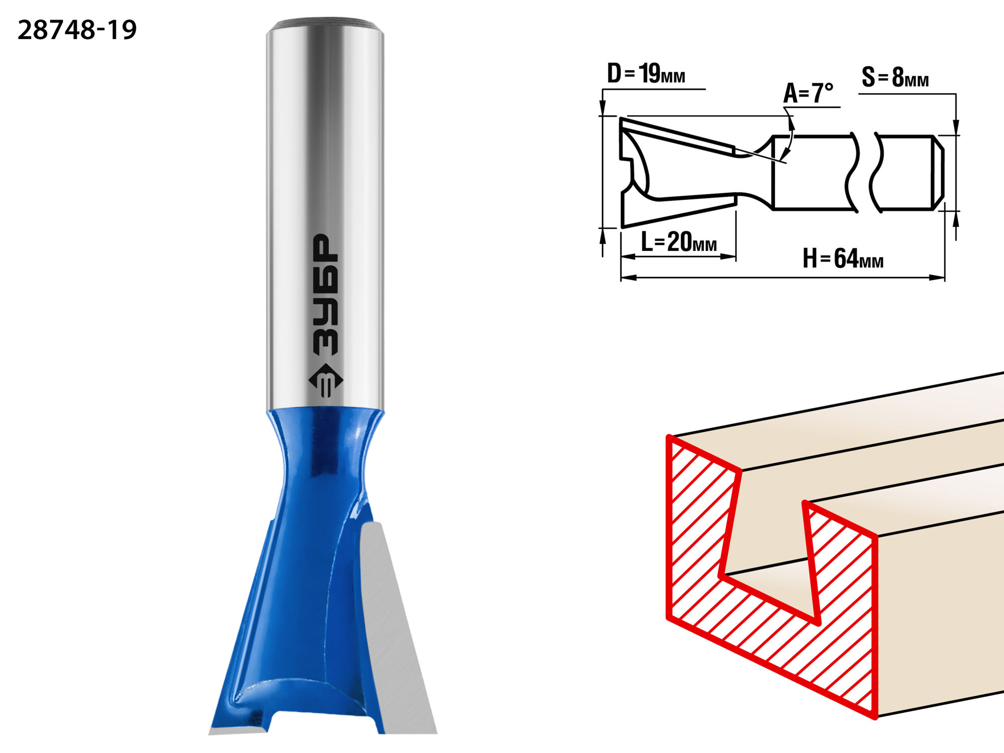 Фреза пазовая фасонная "Ласточкин Хвост", D= 19мм, рабочая длина-20мм, обратный угол-7 градусов, хв.-8 мм, ЗУБР Профессионал / 28748-19