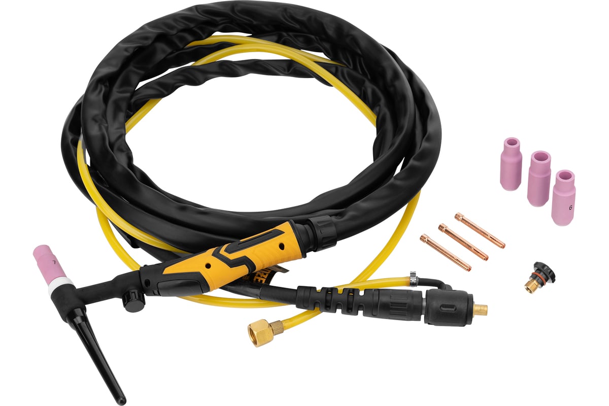Сварочная горелка Denzel TIG WP17V 93643 с рукавом длиной 4 м предусматривает прямое подключение к баллону и используется для аргонодуговой сварки неплавящимся электродом диаметром 1-3,2 мм. Максимальная величина постоянного сварочного тока составляет 140 A, переменного — 125 A. Горелка подходит для работы со сталями и цветными металлами, в т.ч. алюминием.